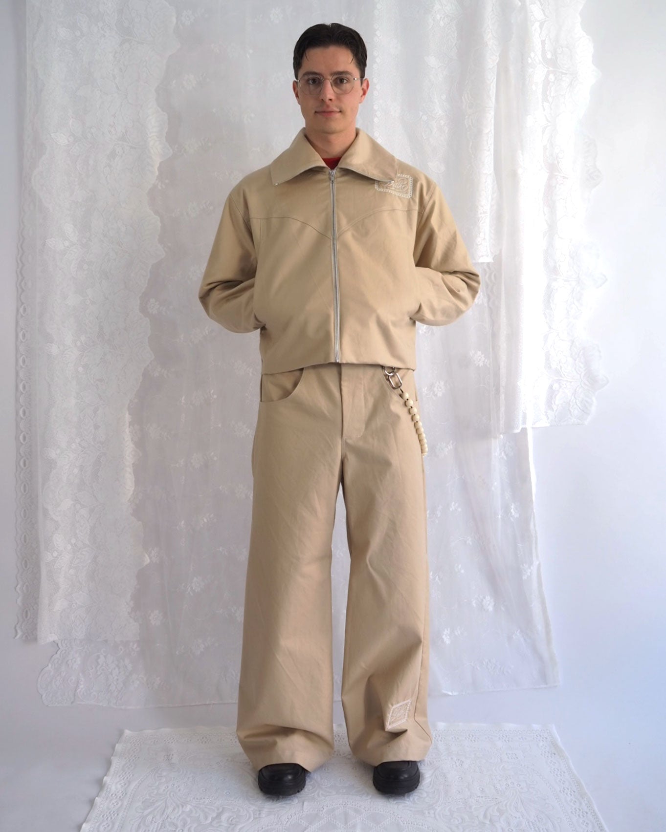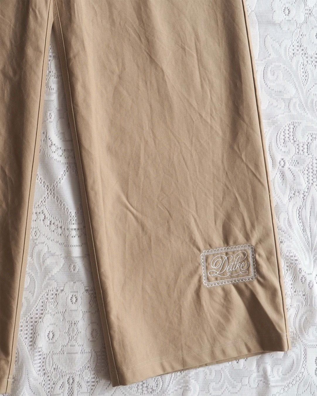 Ein markantes Detail ist die wiederkehrende Doppelgürtelschlaufe mit D-Ring auf der linken Seite, die einen modernen Akzent setzt. Am unteren Bein links befindet sich ein weißer Dettke-Stick mit rechteckigem Rahmen, der der Hose eine dezente Markenkennzeichnung verleiht.