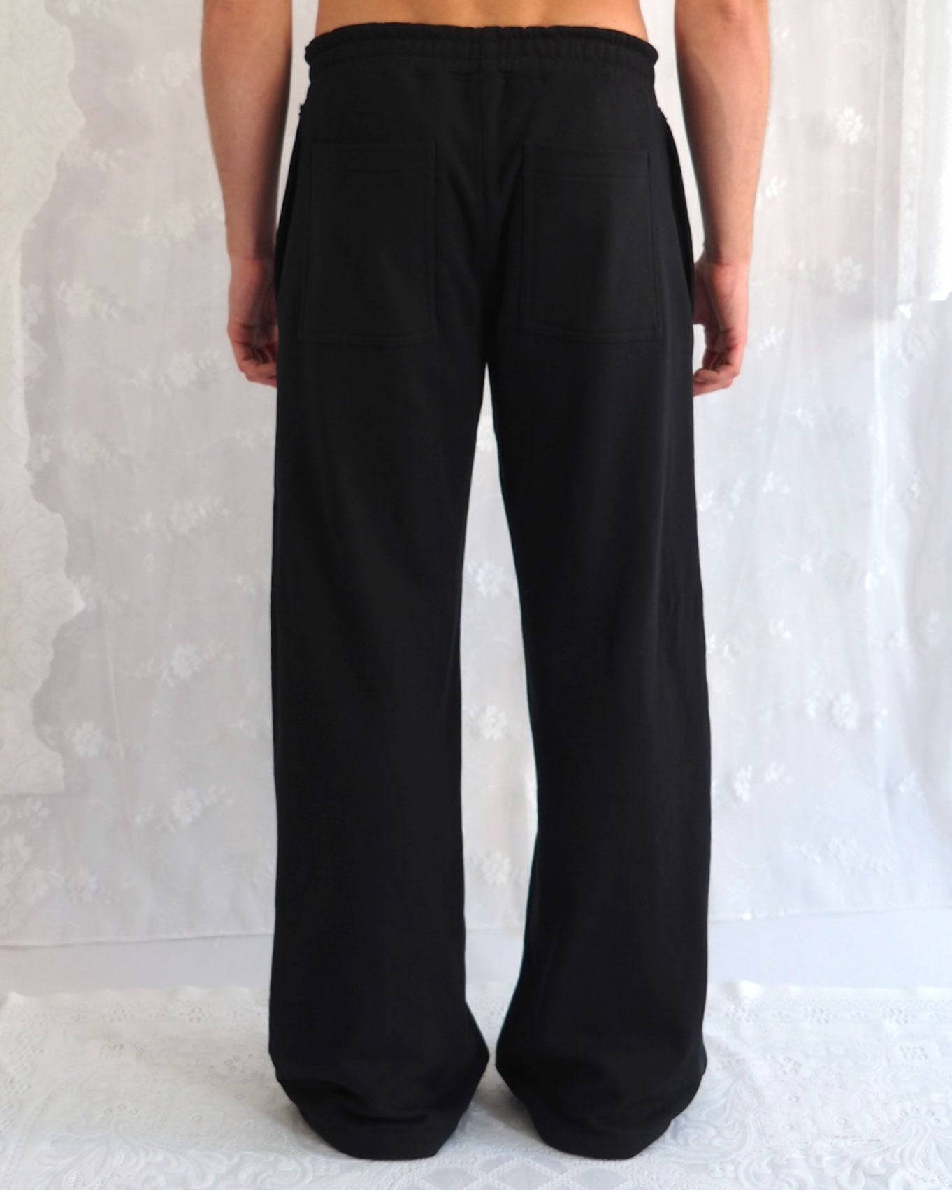 Zwei seitliche Eingrifftaschen bieten praktische Ablage, während ein hellblauer Tortenspitzen-Vinyl-Print auf der Hose einen dezenten Akzent setzt.